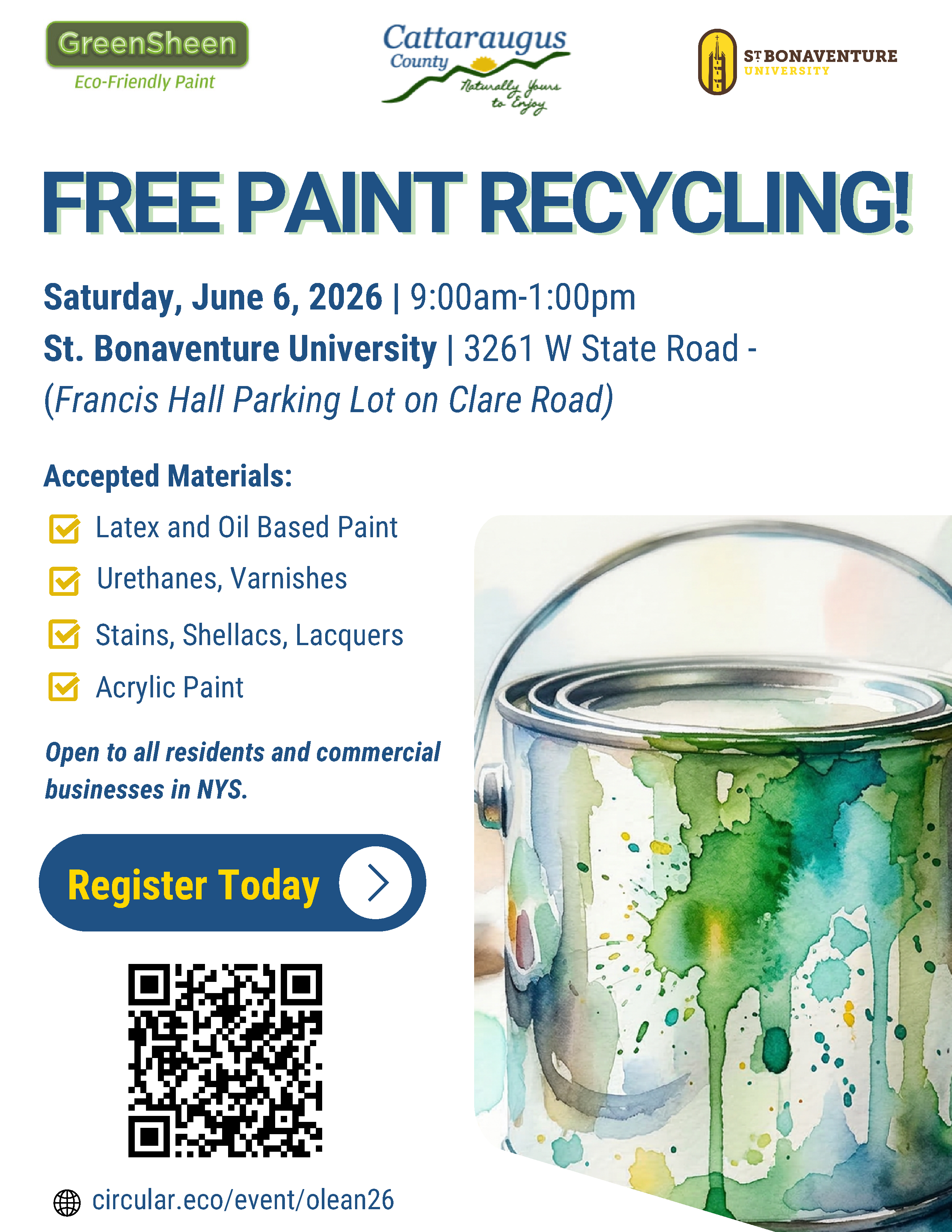OLEAN, NY - In a major win for local environmental conservation, Cattaraugus County is stepping forward as a regional leader in sustainability by partnering with GreenSheen Paint and St. Bonaventure University to host a Free Paint Recycling Event on Saturday, June 6, 2026.