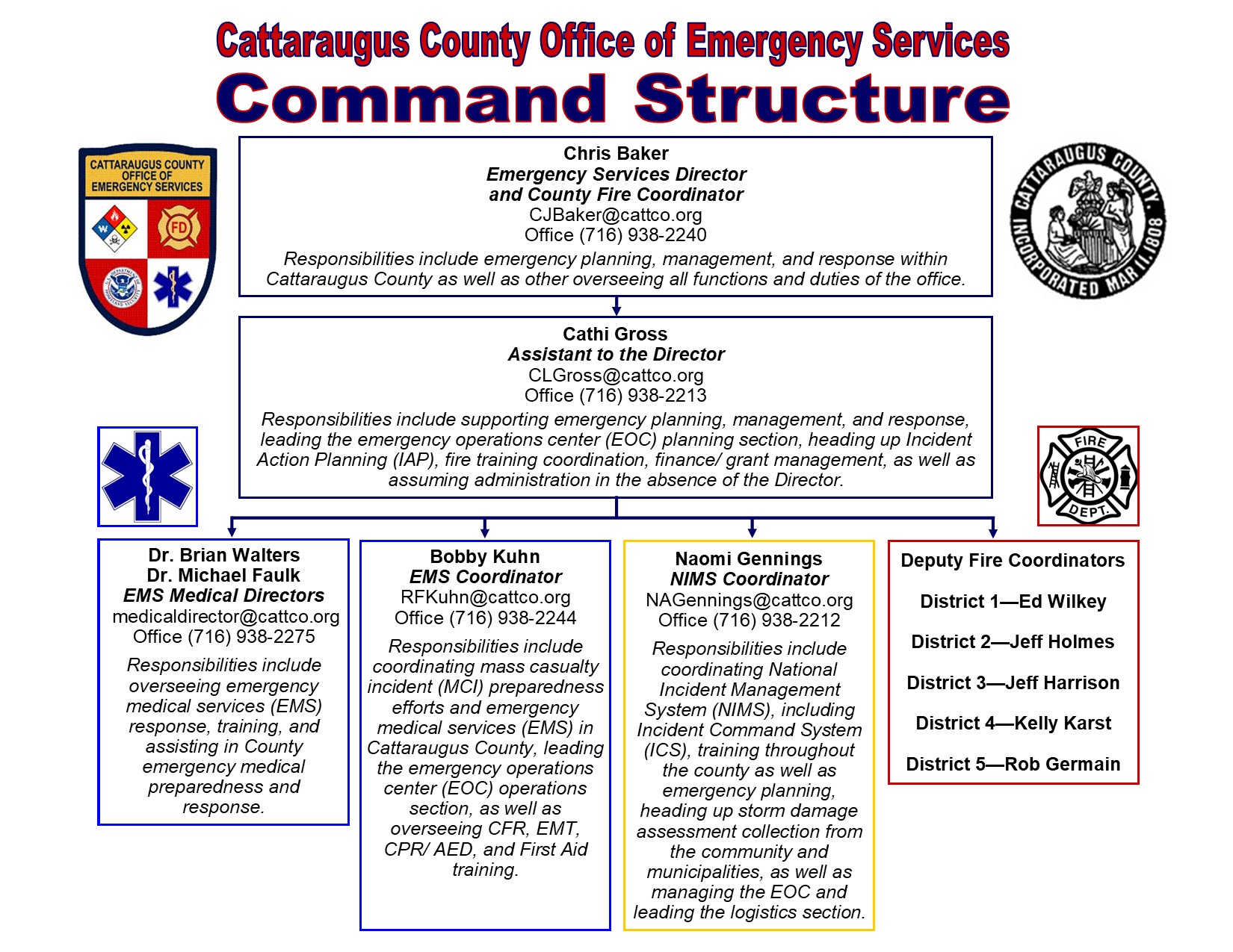 There are 37 fire departments in Cattaraugus County, only 2 of which are career (paid, staffed) departments. Within the Office of Emergency Services are the County Fire Coordinator and five Deputy Fire Coordinators, one for each county fire district (made up of multiple fire response districts/ fire departments) in Cattaraugus County. These Coordinators oversee and direct fire service activity including response to multi-agency emergencies and training requests.